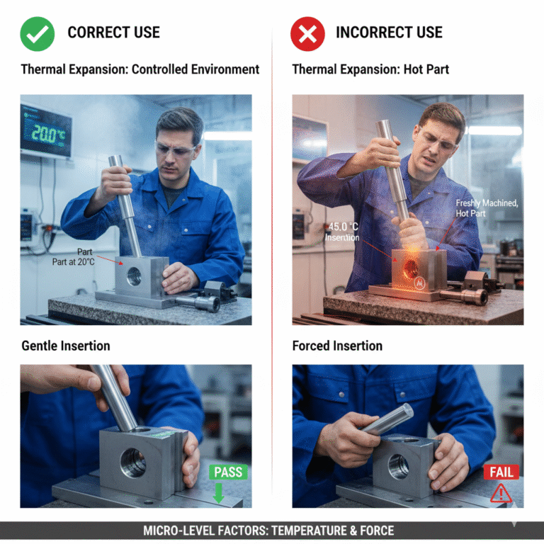 A GO gauge may pass easily when the part is hot—but once it cools back to 20°C, the fit becomes too tight.