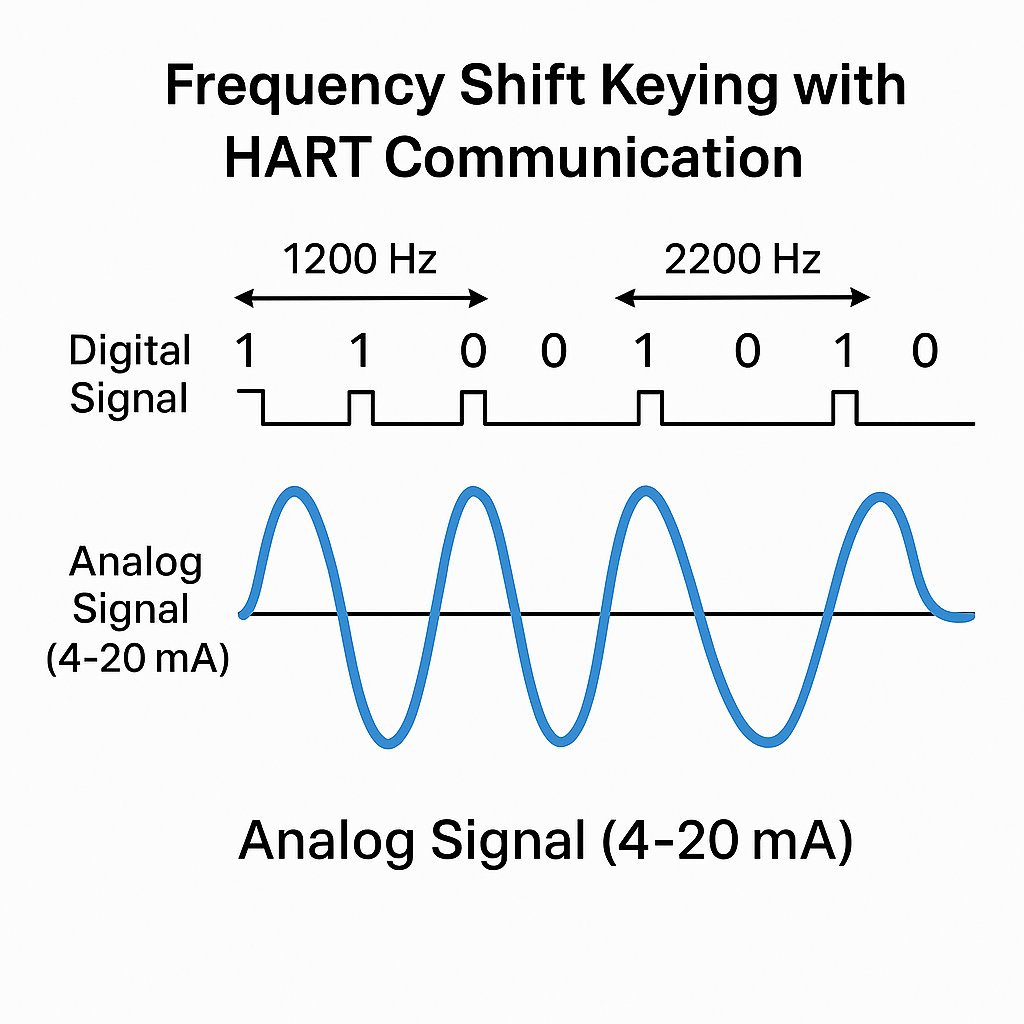 Two sine wave frequencies (1200 Hz for logic “1” and 2200 Hz for logic “0”) are modulated onto the 4–20 mA analog current loop.