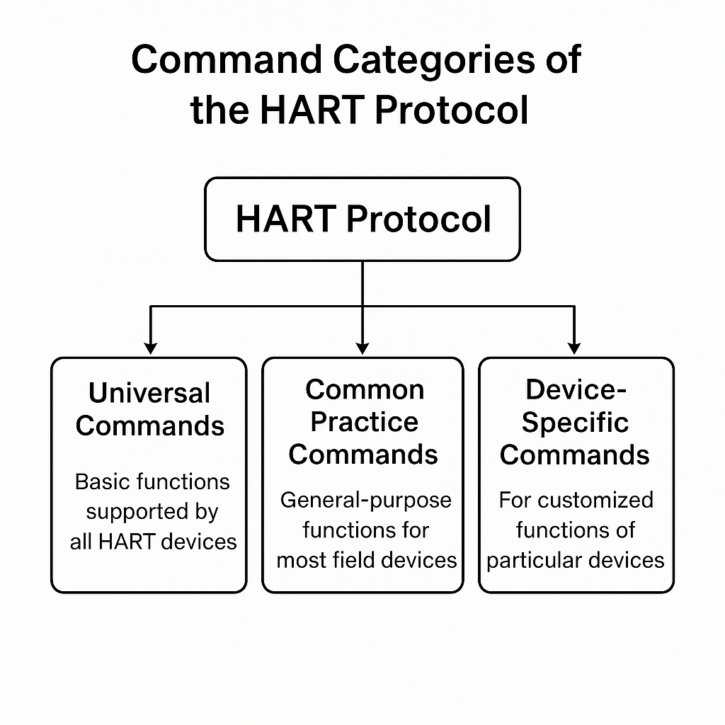 Universal Commands: Basic functions supported by all HART devices (e.g., device identification, range setup).
