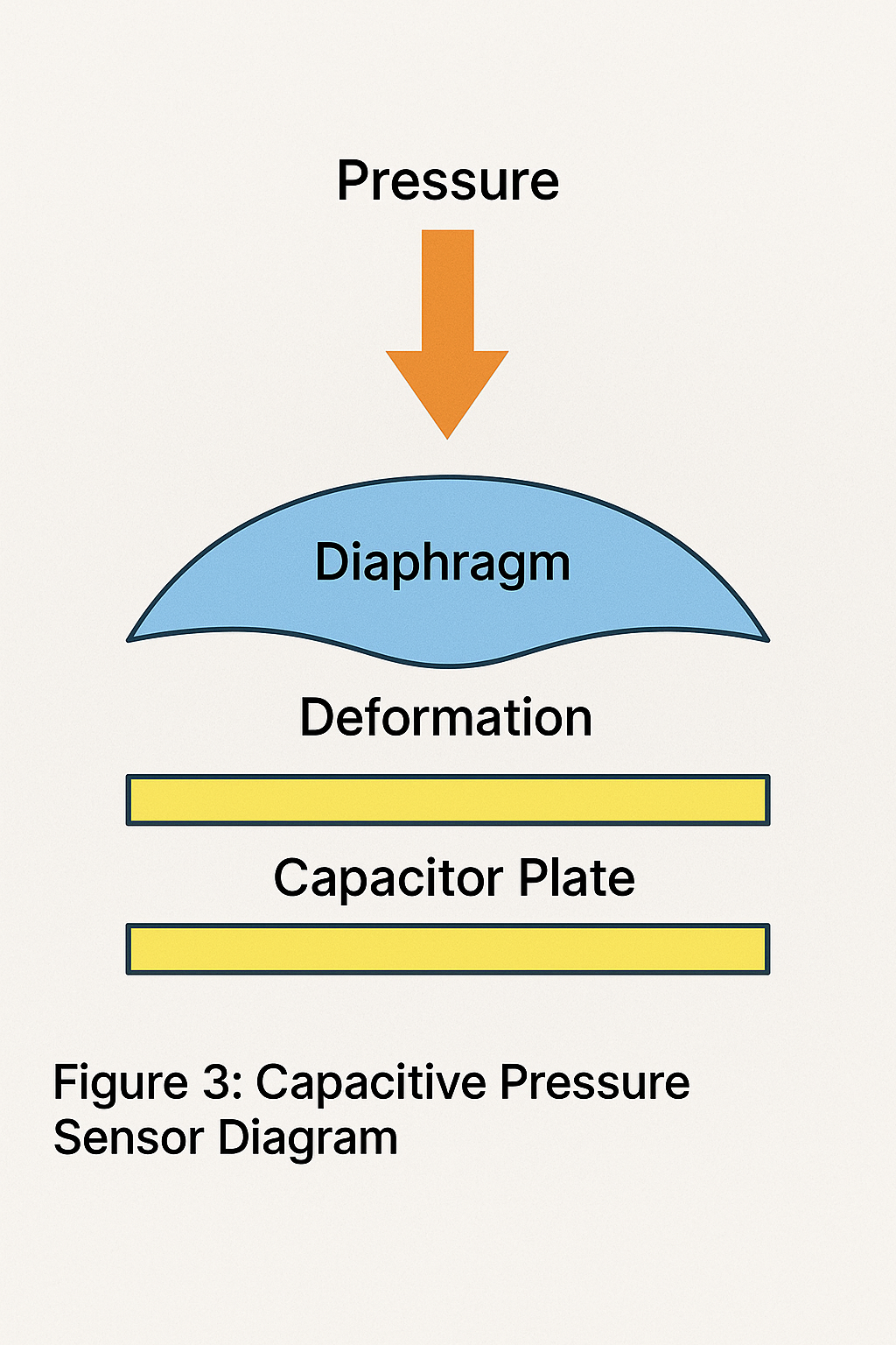 Working Principle: Capacitive pressure sensors use a flexible diaphragm as one plate of a capacitor. When pressure is applied, the diaphragm deforms, changing the distance between the plates and hence the capacitance. This change is converted into a corresponding voltage signal using electronic circuitry.