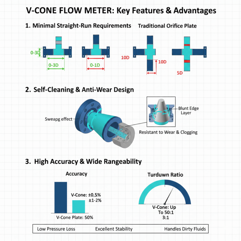 The V-cone flow meter is a robust, accurate, and low-maintenance differential-pressure device that offers a superior alternative to traditional orifice plates. With excellent long-term stability, wide rangeability, low installation requirements, and compatibility with challenging media, it is increasingly adopted across oil & gas, chemicals, power, metallurgy, and municipal applications for reliable energy and process measurement.