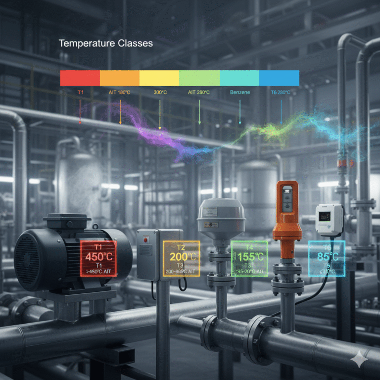Some people mistakenly believe that T1 is “higher” than T6, but in fact, it’s the opposite. T1 allows a maximum temperature of 450°C, while T6 has a surface temperature limit of only 85°C. The higher the number, the lower the allowable temperature, meaning a higher explosion protection level.