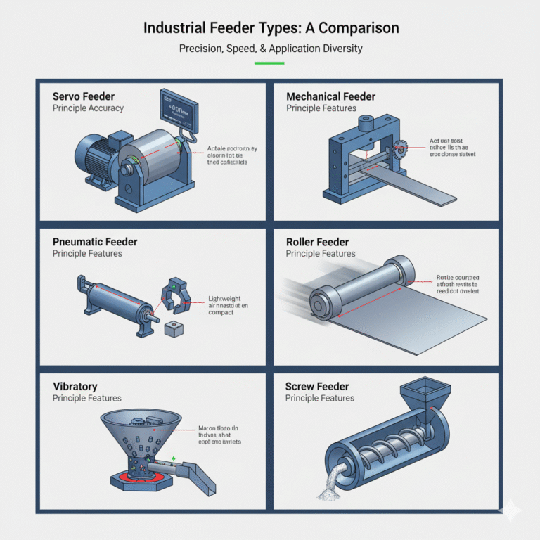 | Pneumatic Feeder | Pneumatic cylinder | ±0.3mm | ≤1.5mm | Low cost, easy maintenance | Small parts stamping, light load |