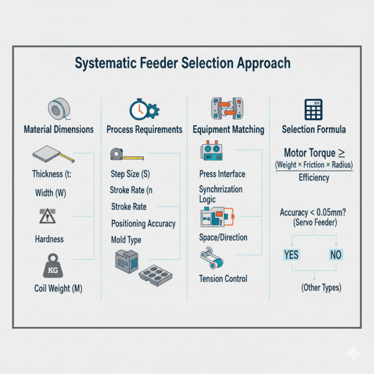| Mechanical Feeder | Linkage or eccentric wheel | ±0.2mm | ≤2.5mm | Strong synchronization with presses, simple structure | Medium and low-speed stamping lines |