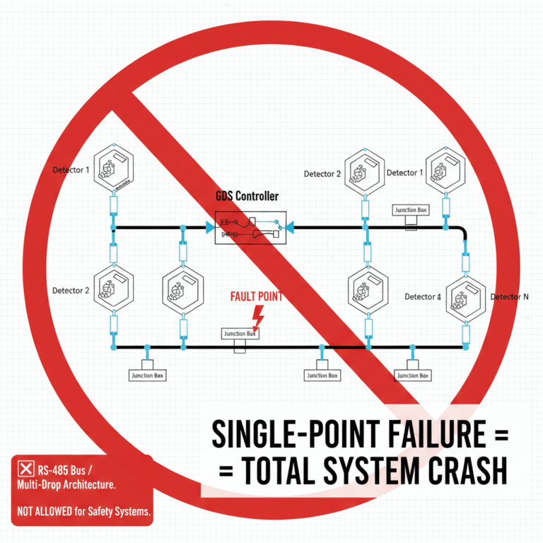 For this reason, international and domestic standards clearly state that GDS field detectors must NOT be connected using a shared bus network, including RS-485 multi-drop wiring.