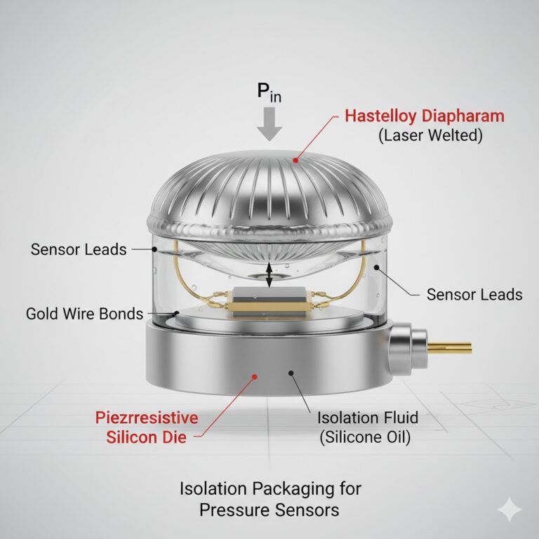 Pressure sensors use pressure-sensitive chips (such as piezoresistive silicon membranes) to detect pressure changes. If the sensor comes into direct contact with corrosive media, the silicon membrane may be damaged, affecting performance and reducing the sensor’s lifespan. Therefore, protective packaging is required to safeguard the pressure-sensitive chip while still allowing the pressure to be transmitted to the diaphragm.