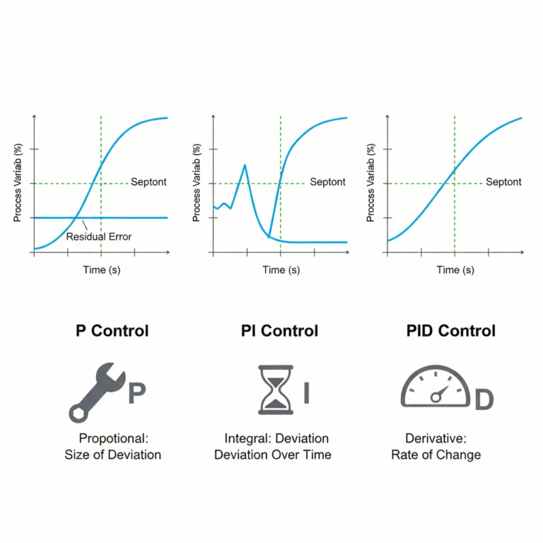 • Proportional Control (P): Suitable for systems with small load changes, minimal pure time delay, and where some residual error is acceptable. The process does not require very high precision.