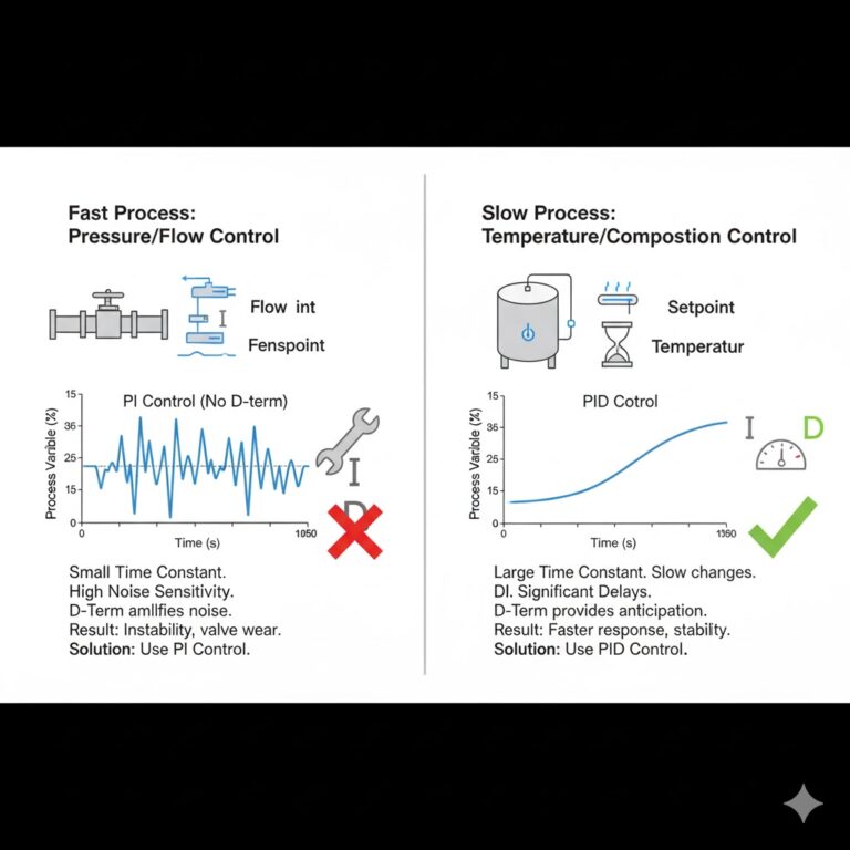 On the other hand, temperature and composition systems usually have larger time constants in both the measurement and control loops. In such systems, the anticipatory nature of derivative control proves effective, helping to improve control quality by mitigating excessive variations and speeding up the system’s response.