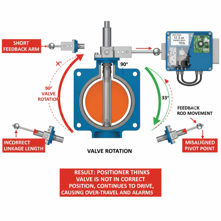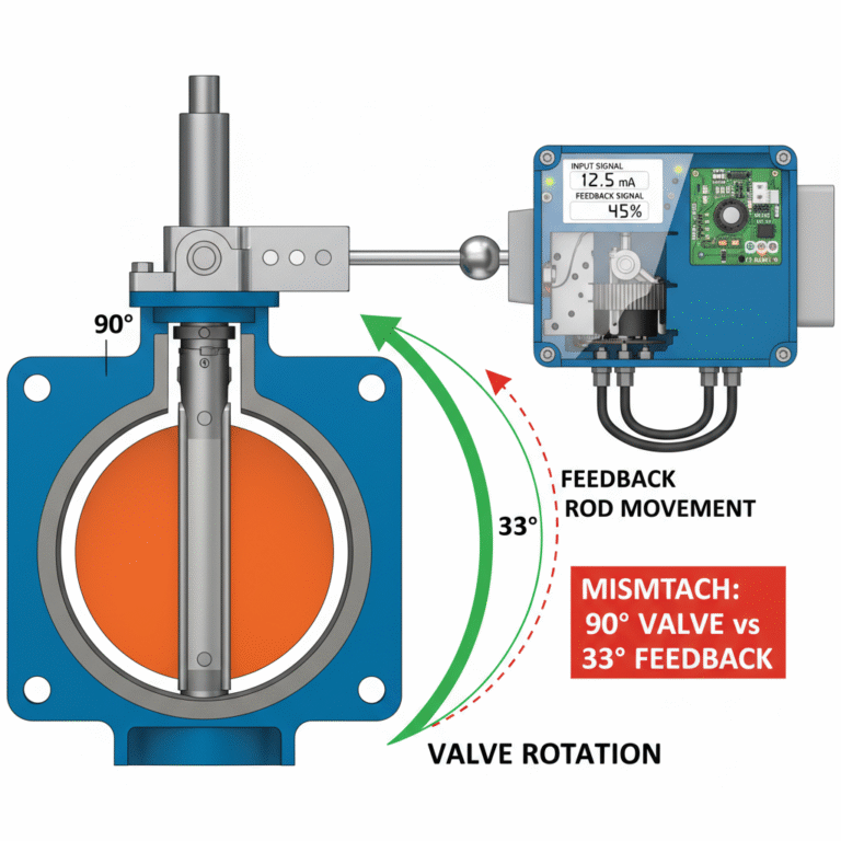 Here’s the key point: the positioner tracks the movement of the feedback rod, not the valve itself. In a properly matched system, when the valve rotates 90°, the feedback rod should also rotate 90° (1:1 ratio). However, if the connection components are misaligned (such as an incorrectly sized feedback arm or linkage), the feedback rod may only rotate 33°, creating a ratio mismatch (about 2.7:1). In this case, the positioner will continue to drive the valve, mistakenly thinking it hasn’t reached the correct position.