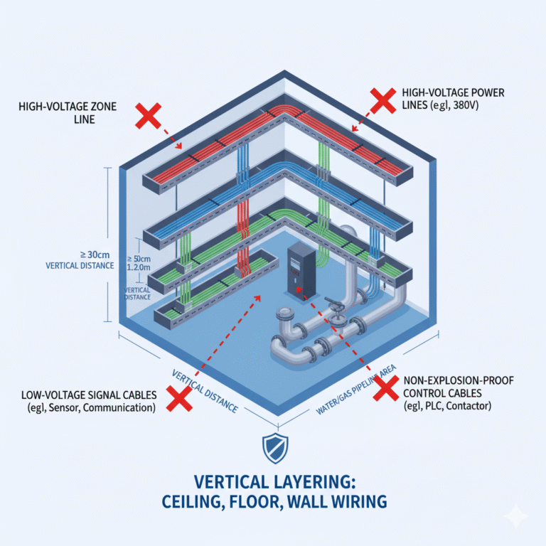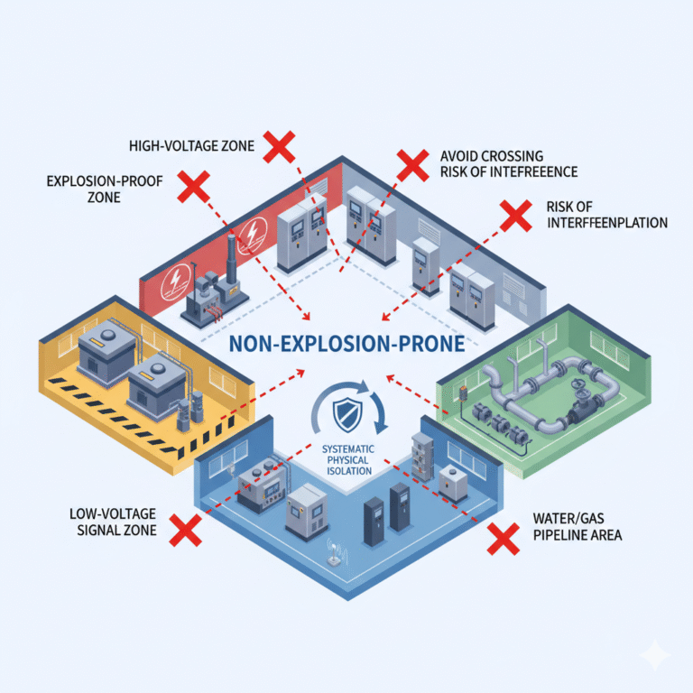 When wiring in non-explosion-proof zones, it’s crucial to prevent intersections with other areas such as explosion-proof zones, high-voltage zones, low-voltage signal zones, and water/gas pipeline areas. The primary goal is to avoid interference, mitigate safety risks like leakage or short circuits, and ensure system stability. This can be achieved through systematic design focused on physical isolation, path planning, and wiring standards. Below are the key approaches.